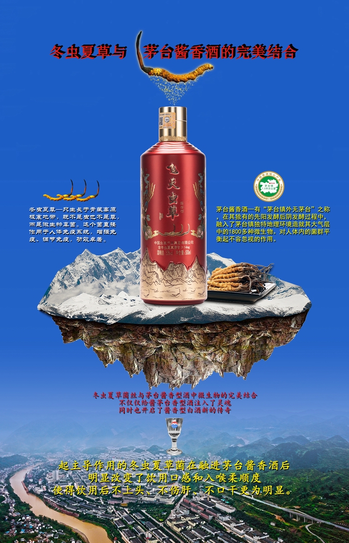 茅台镇的酱香型白酒,因其独特的地理环境、地道的当地红樱子高粱,繁复的酿造工艺,严格的窖藏时间,造就了酱香型白酒饮用后能够不上头、不辣喉、不烧心、不口渴,添加冬虫夏草有效成分后更是增强了对肝脏的保护,表现出酒精代谢速度成倍提高,确保了饮酒的安全性。中国虫草产业集团在茅台镇投资的贵州飞草酒业有限公司不生产酒,却与茅台集团及茅台镇各大酒厂强强合作,选用优质合格酒体,添加冬虫夏草有效成分,成就高品质“飞天虫草酒”“冬虫夏草酒”系列。可代理销售,可企业定制。诚邀有意者来茅台实地考察了解。